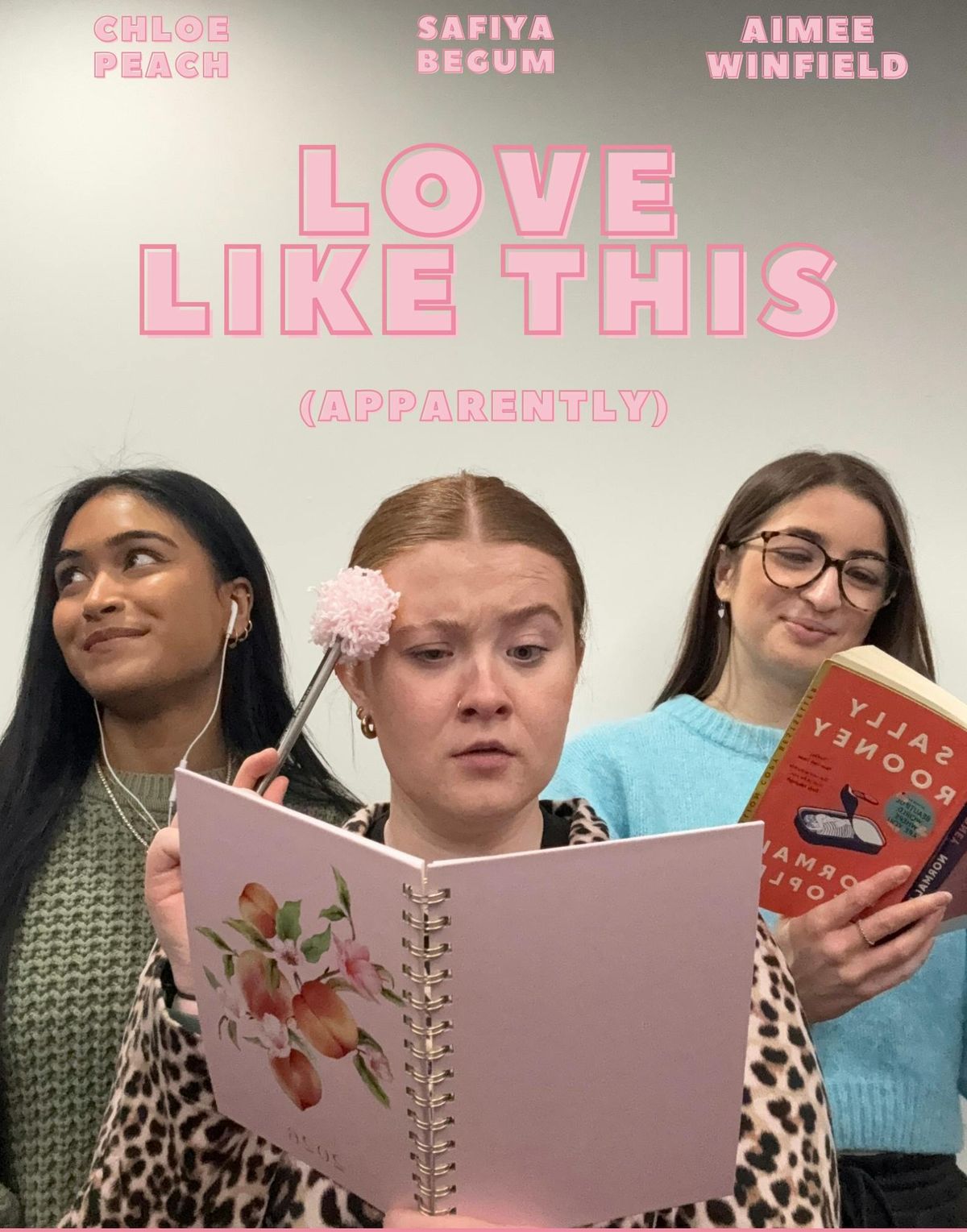 LOVE LIKE THIS (APPARENTLY) 12 MAY 2026, 7PM-7:40PMGROSVENOR EAST BUILDING, STUDIO 1.04“Love like this (apparently)” is a chaotic, funny and slightly too honest performance about one big question: How do we actually view love....... and why is it so confusing? This is a question many of us ask, but can we ever really find an answer to? We bring to life the dramatic highs, awkward lows and questionable life choices that love stories are built on. Join us as we take inspiration from romcoms, books and heartbreak anthems to poke fun at the picture-perfect stories we’ve been sold. It’s messy, relatable and asks if love really is like this or have we all just been sold a lie.Credits: Co-creation and performance by Chloe Peach, Safiya Begum, Aimee Winfield. Costume design by Safiya Begum Production design by Chloe Peach. Produced by Aimee Winfield