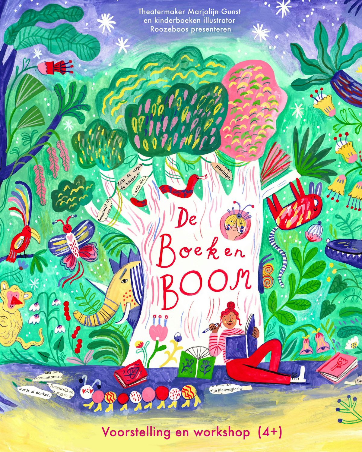 Over de makers van De BoekenboomDe Boekenboom is geschreven en geregisseerd door Marjolijn Gunst, een theatermaker en docent die niet terugschrikt voor diepgang en met verbeeldingskracht de jeugd weet te raken.De rijk beschilderde decors zijn van de hand van illustrator Roozeboos. Haar werk is vrolijk, energiek en vol van details waar je eindeloos in kan blijven dwalen.In deze voorstelling staat ze ook op het toneel, waar ze een bonte stoet wonderlijke wezens tot leven brengt. Figuren die de schrijver, gespeeld door Annelieke Joosten, op haar avontuur ontmoet.