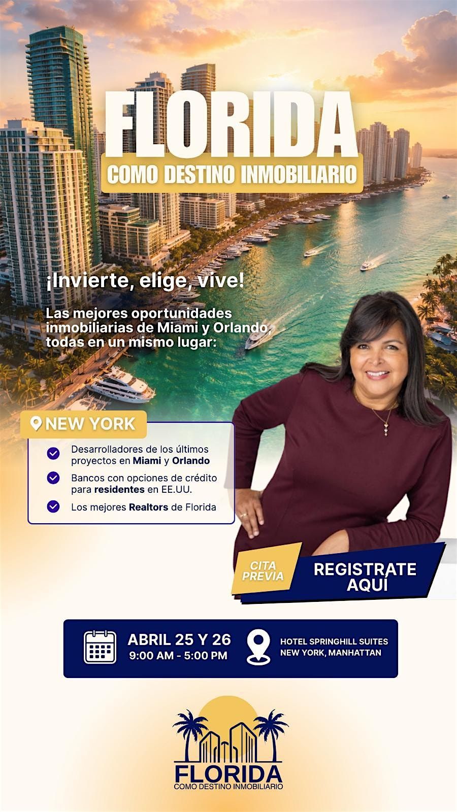 Ven a conocer todo sobre FLORIDA COMO DESTINO INMOBILIARIO NEW YORK, un evento en persona donde te contamos por qué invertir en Florida es la onda. Conéctate con expertos, explora oportunidades y saca ventaja de un mercado que no para de crecer. ¡No te lo pierdas!