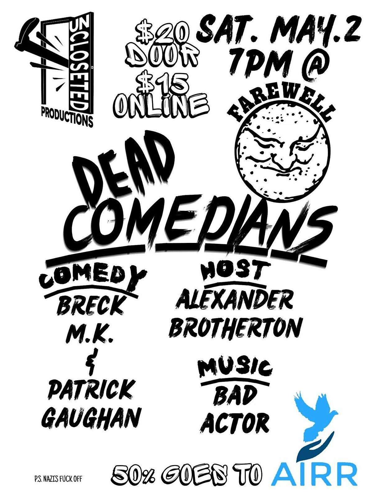 Then Dead Comedians is the live show for you! No jokes punching down, and no backing down in the face of fascism. Laugh with comedians unafraid to roast nazis! Then blow off steam with musicians against the regime! With 50% of sales going to the local non-profit AIRR.