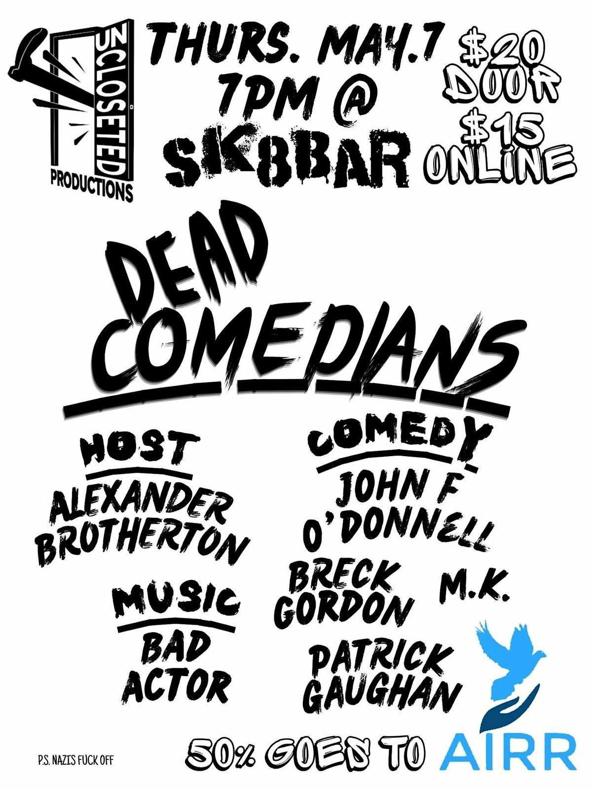 Then Dead Comedians is the live show for you. No jokes punching down and no backing down in the face of fascism. Laugh with comedians unafraid to roast nazis. Then blow off steam with musicians against the regime. With 50% of sales going to the local nonprofit AIRR!