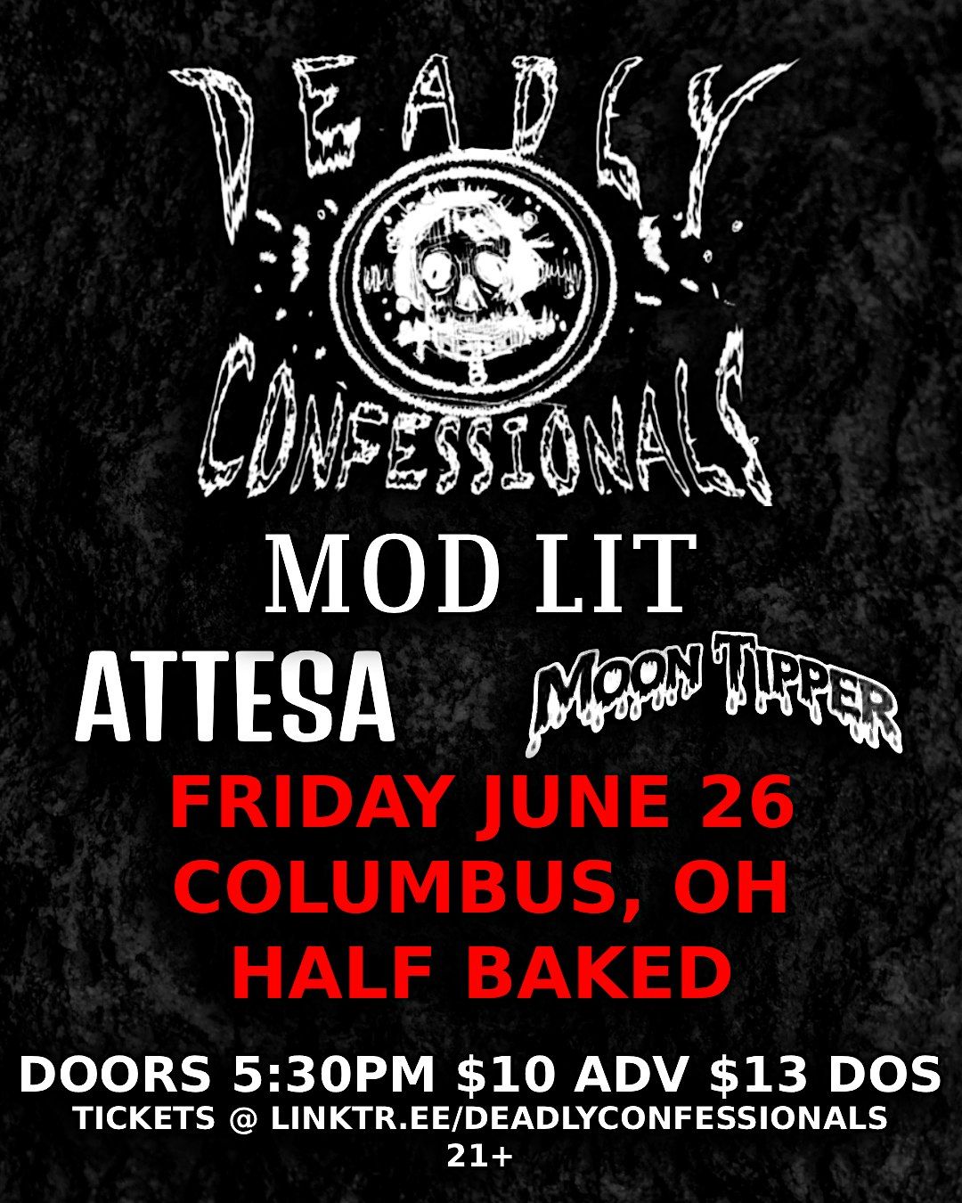 Deadly Confessionals with Mod Lit, Attesa, and Moon Tipper in Columbus, Ohio at Half Baked. Doors 5:30pm / Show 6:30pm. $10 in advance 21+About this Event