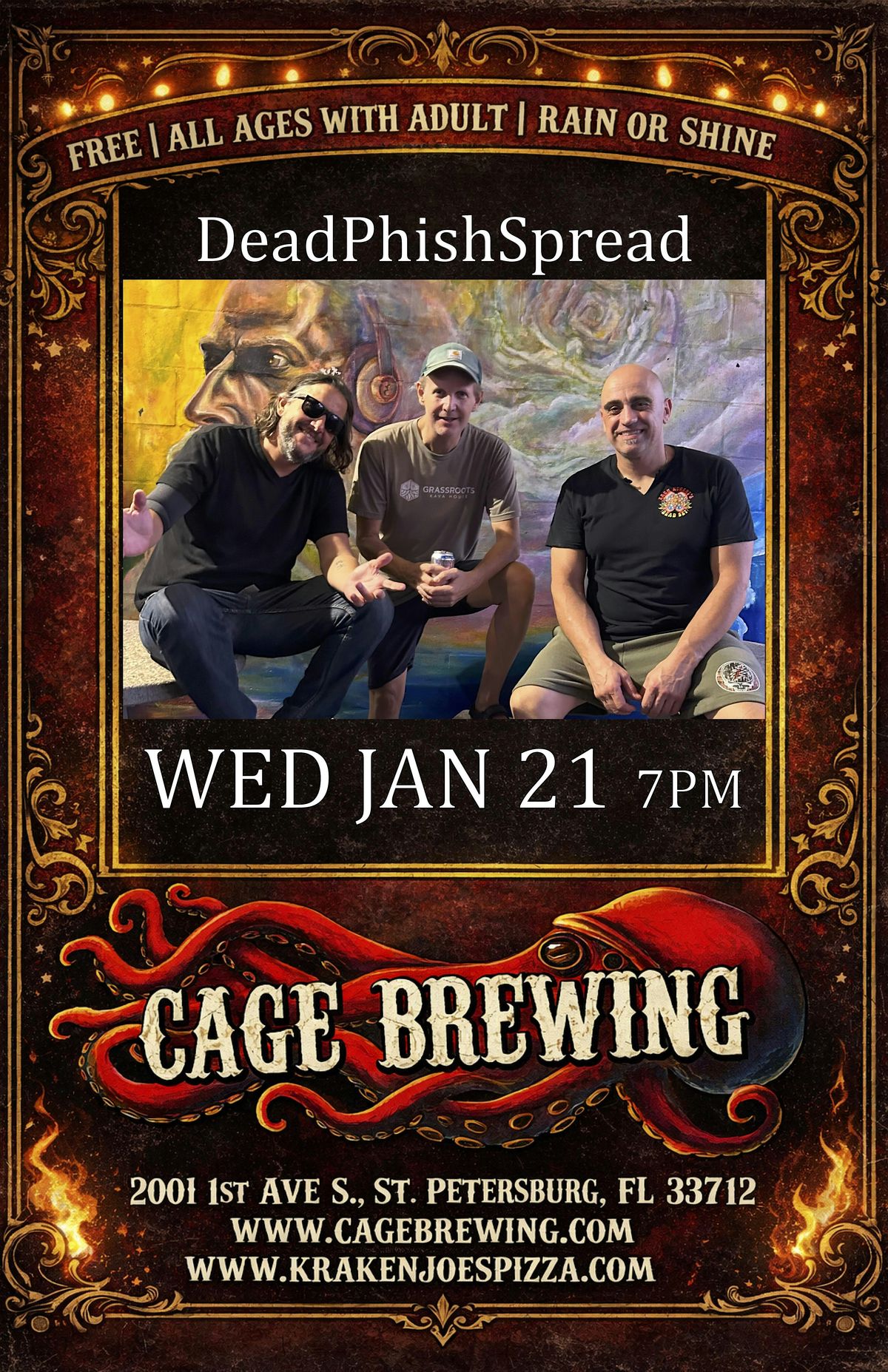 Come join us for a night of music Grateful Dead, PHISH, and Widespread Panic intertwined & combined at Cage Brewing! Get ready for an evening filled with great tunes and good vibes. This event is free entry, so bring your friends and let's have a blast together. See you there!