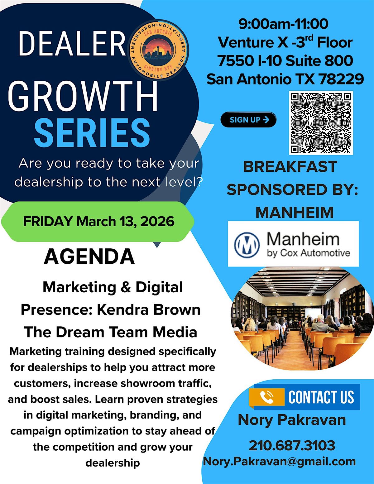 Each 90-minute session includes expert training, live Q&A, and networking so you walk away with real tools you can use immediately. Manheim San Antonio will be Sponsoring Lunch for the entire series.