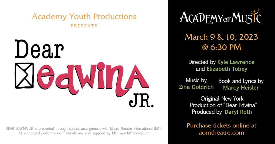 The Academy Youth Productions’ presentation of Dear Edwina Jr. celebrates the efforts of student performers on stage at the Academy for over ten years running. Dear Edwina Jr. follows the adventures of plucky advice-giver-extraordinaire, Edwina Spoonapple, as she directs the neighborhood kids in a series of buoyant production numbers for the latest edition of her weekly Advice-a-Palooza. Edwina and her friends share wisdom on everything from trying new foods to making new friends through clever, catchy and poignant songs.