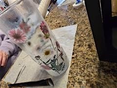 As you find your seats at the table, you'll find all of the ingredients that you'll need to design a lovely spring Pressed Flower glass candle holder. You'll also receive a battery operated candle to insert in your glass candle holder so that you may enjoy this beautiful reminder of spring as you find the perfect place for it in your home.
