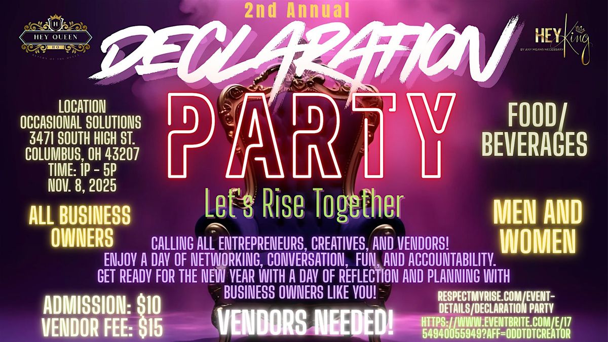 Join us for our 2nd annual Declaration Party where we mix a Networking Event with a New Year's Eve Party. And an accountability table talk with a vision board party! This will be an afternoon of networking, conversation, food, beverages, and fun! This year, we are adding something new to the mix and inviting vendors from all over Ohio to join us in our celebration! We hold this event to bring business owners, entrepreneurs, content creators, and influencers under one roof with three goals. To network, sell, and support! But, this isn't like your regular networking event. We put together a space where we can network, share/sell our products, and have meaningful conversation among people who walk the same walk. The vendors will get a chance to sell their products for a while. You get a chance to mingle and meet different entrepreneurs. Then, we all come together to have a discussion about our vision for our businesses for next year. We will discuss what we have learned this year, and what we can do to make our business better for next year amongst seasoned and unseasoned entrepreneurs. We will also leave room for those tough questions and conversations. For example: