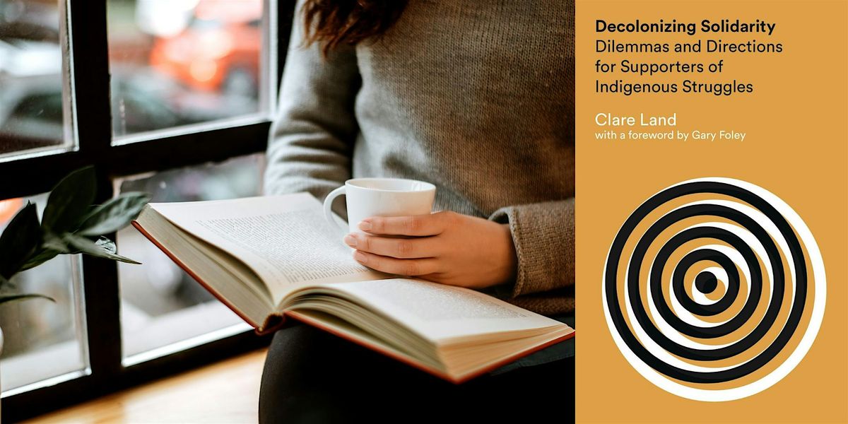 Image: A seated person holds an open book and teacup. Next to this, the book cover of Decolonizing Solidarity by Clare Land.