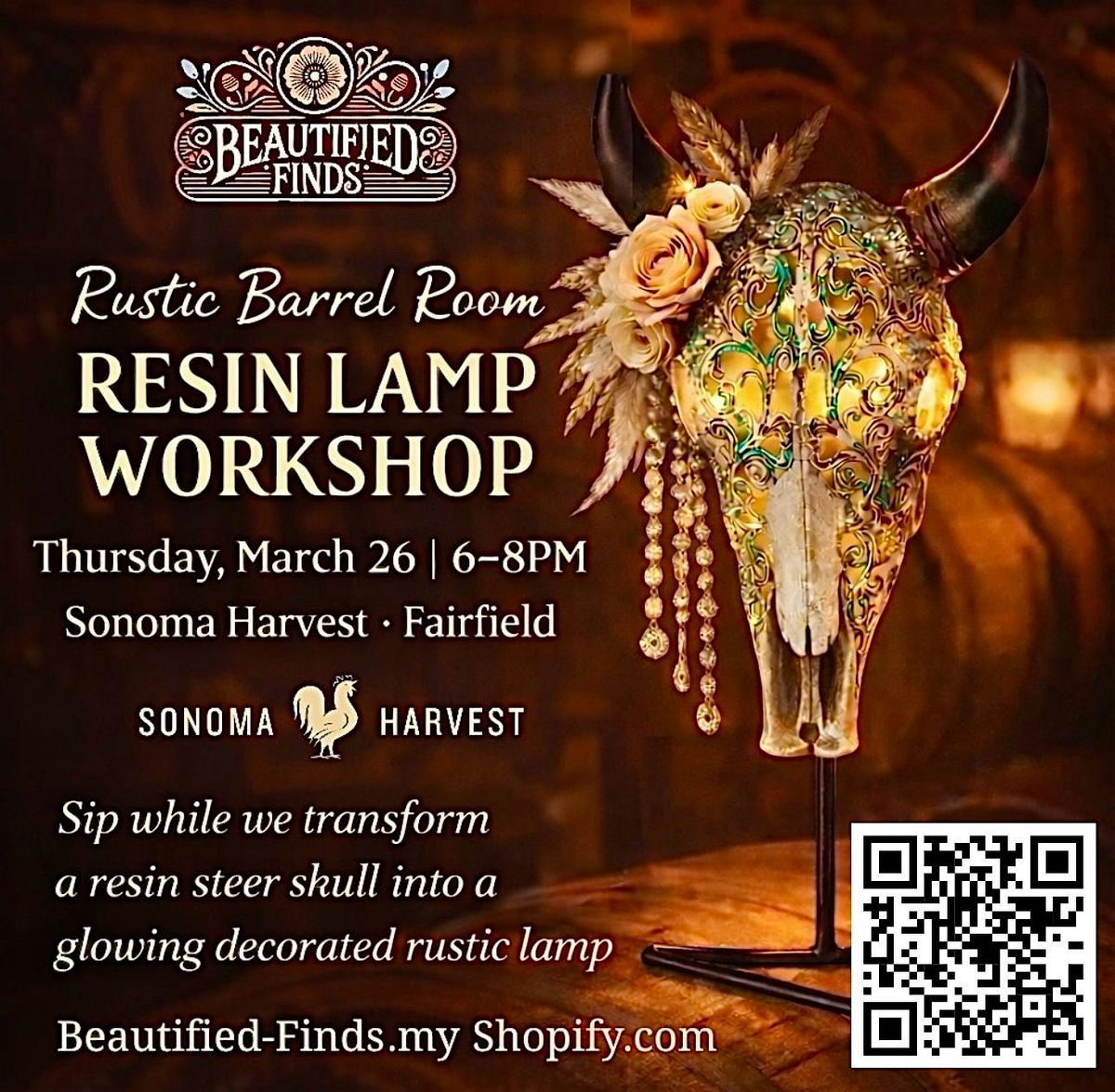 Join us in the barrel room for a cozy creative evening transforming a carved resin steer skull into a glowing rustic statement lamp.