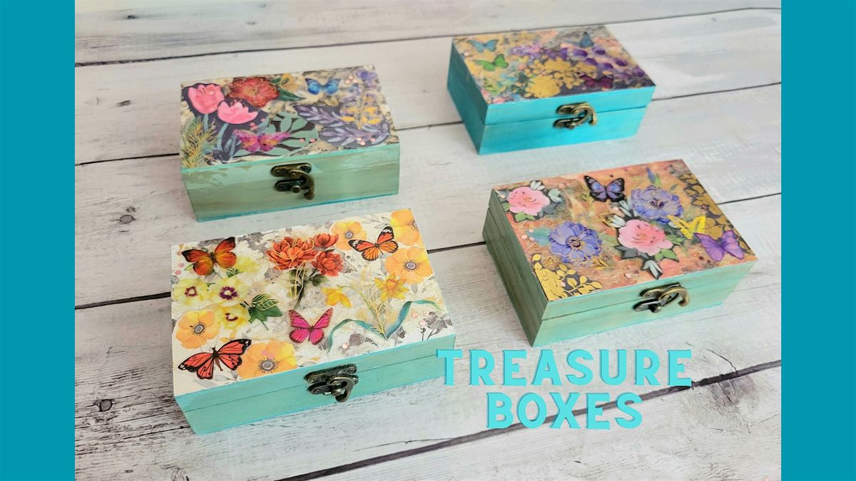 Come join us for a fun in-person workshop where you'll get to create your very own Decoupage Treasure Box! Bring your creativity and enjoy a relaxing time decorating 6x4x2 wooden boxes with beautiful paper designs and varnish. Perfect for DIY lovers or anyone looking to try something new and crafty. Don't miss out on this hands-on experience to make a unique keepsake or gift!