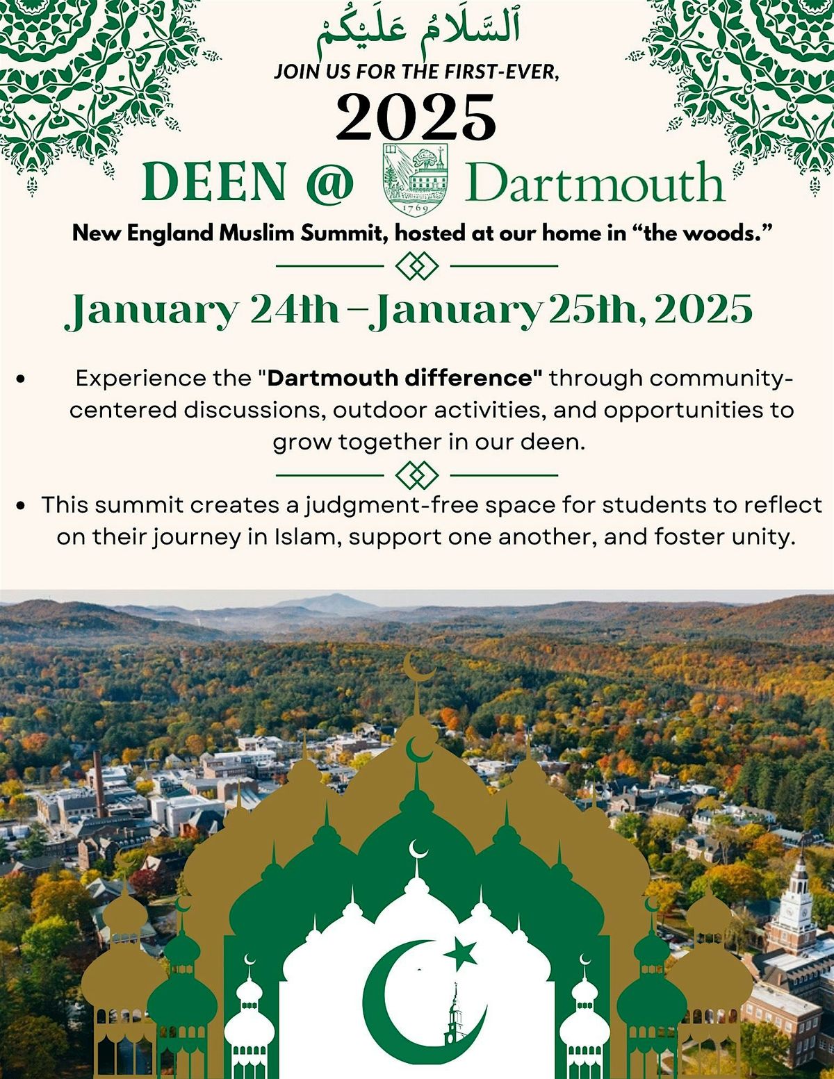 We hope that this finds you well. On behalf of Dartmouth College's Al-Nur Muslim Student Association, we are thrilled to announce our New England Muslim Student Summit - Deen @ Dartmouth, which is scheduled to take place from Jan 30th - Jan 31st, 2026!