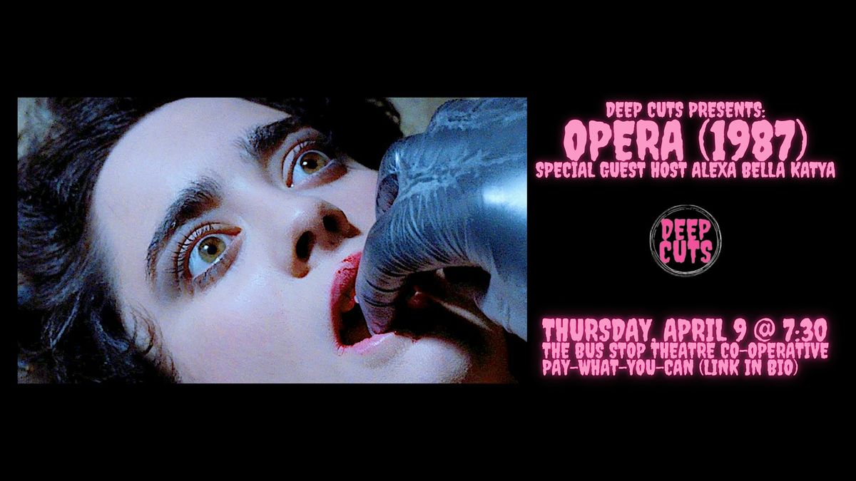Deep Cuts presents the stunning1987 Dario Argento giallo Opera with special guest host Alexa Bella Katya.In Opera, rising opera star Betty is persued by a psychotic killer who forces her to watch as he kills her friends and family. Will Betty be next? Starring Cristina Marsillach, Urbano Barberini, Daria Nicolodi, and Ian Charleson, with music by Brian Eno, Claudio Simonetti, and Bill Wyman. Considered the last great Argento horror film, Opera has been described by critics as "exceptional visual experience" and that director Dario Argento "hits his decadently bloody high notes here."