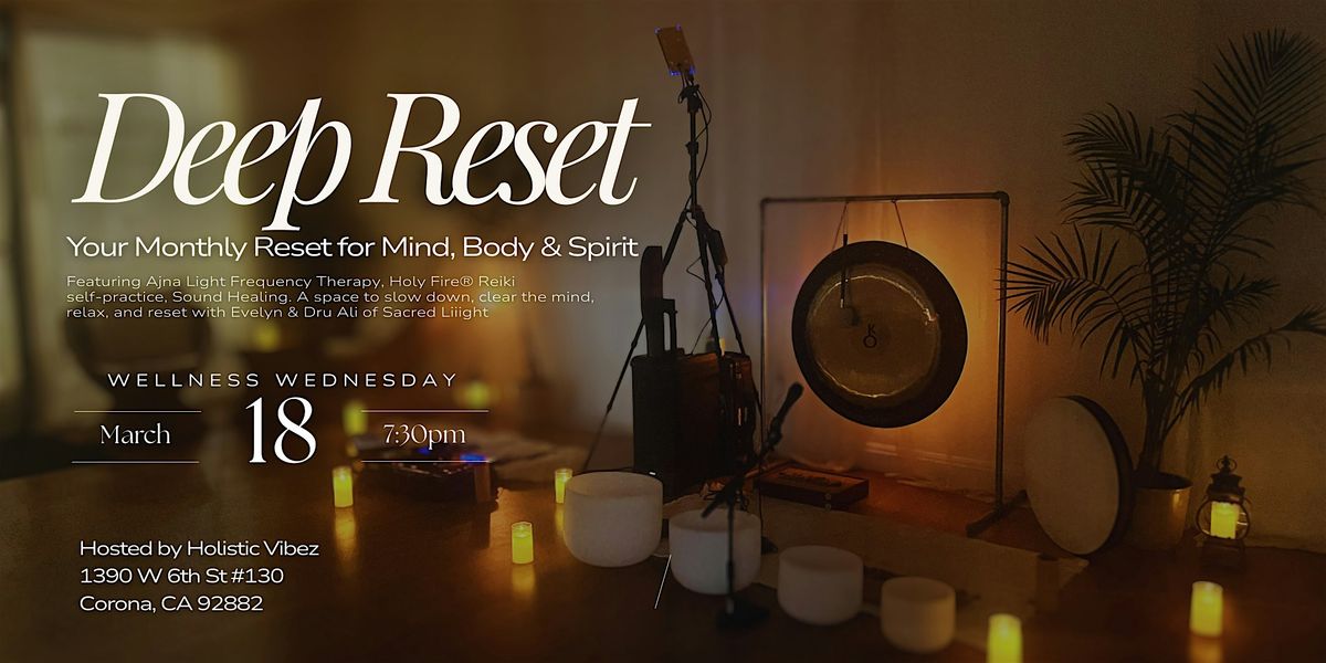 Wellness Wednesday: Deep Reset is a monthly sound healing and meditation experience in Corona, CA. Hosted by Evelyn and Dru Ali of Sacred Liiight, in collaboration with Holistic Vibez, this one-hour experience blends Ajna Light Neurotechnology, gentle movement, and vibrational sound, to support deep renewal in a calm, welcoming environment.