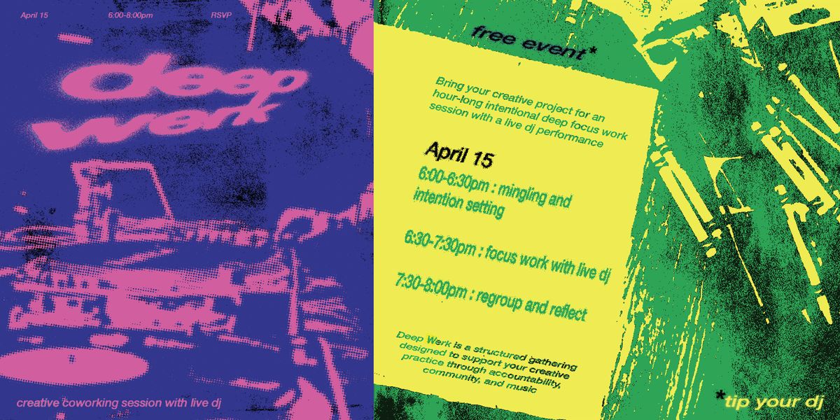 Stop ignoring your creative projects and get to work with a community of creatives and live music! Deep Werk is a structured gathering designed to support your creative practive through accountability, community, and music.