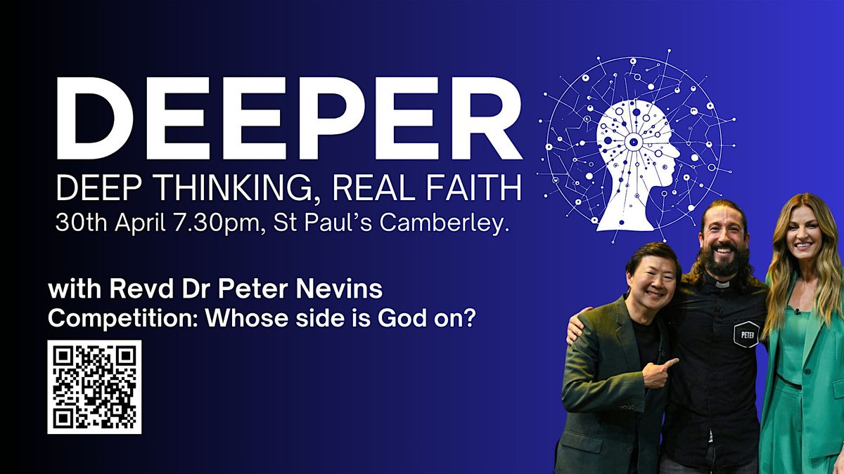 Our next Deeper event is hosted by Revd Dr Peter Nevins, vicar at St John the Evangelist, North Holmwood and recent winner of US game show, 99 to Beat! Peter will be speaking on Competition: Whose Side is God On?