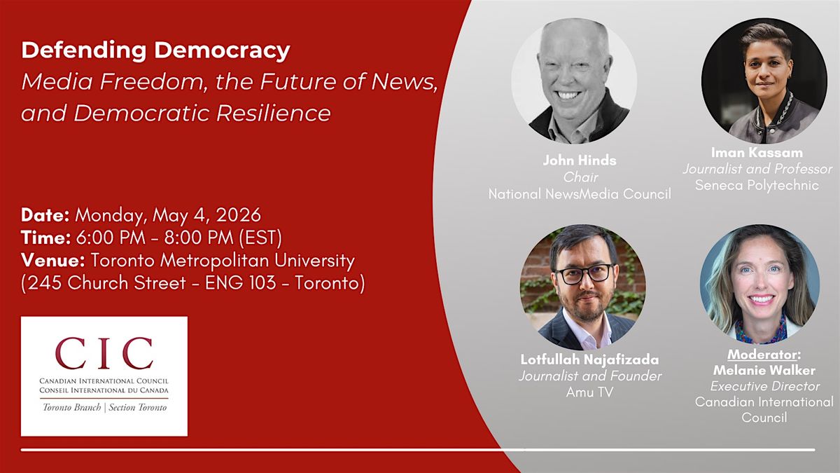 The Canadian International Council's Toronto Branch is pleased to invite you to an expert panel discussion on the future of independent editorial media in Canada and around the world. As state censorship, bans on journalism, and digital manipulation reshape the global media landscape, independent newsrooms face compounding pressures — from rising authoritarianism and collapsing revenue models to growing news avoidance and the spread of disinformation. This panel will explore what it takes to protect and sustain independent journalism, engage younger audiences, and strengthen democratic resilience in the face of these challenges.