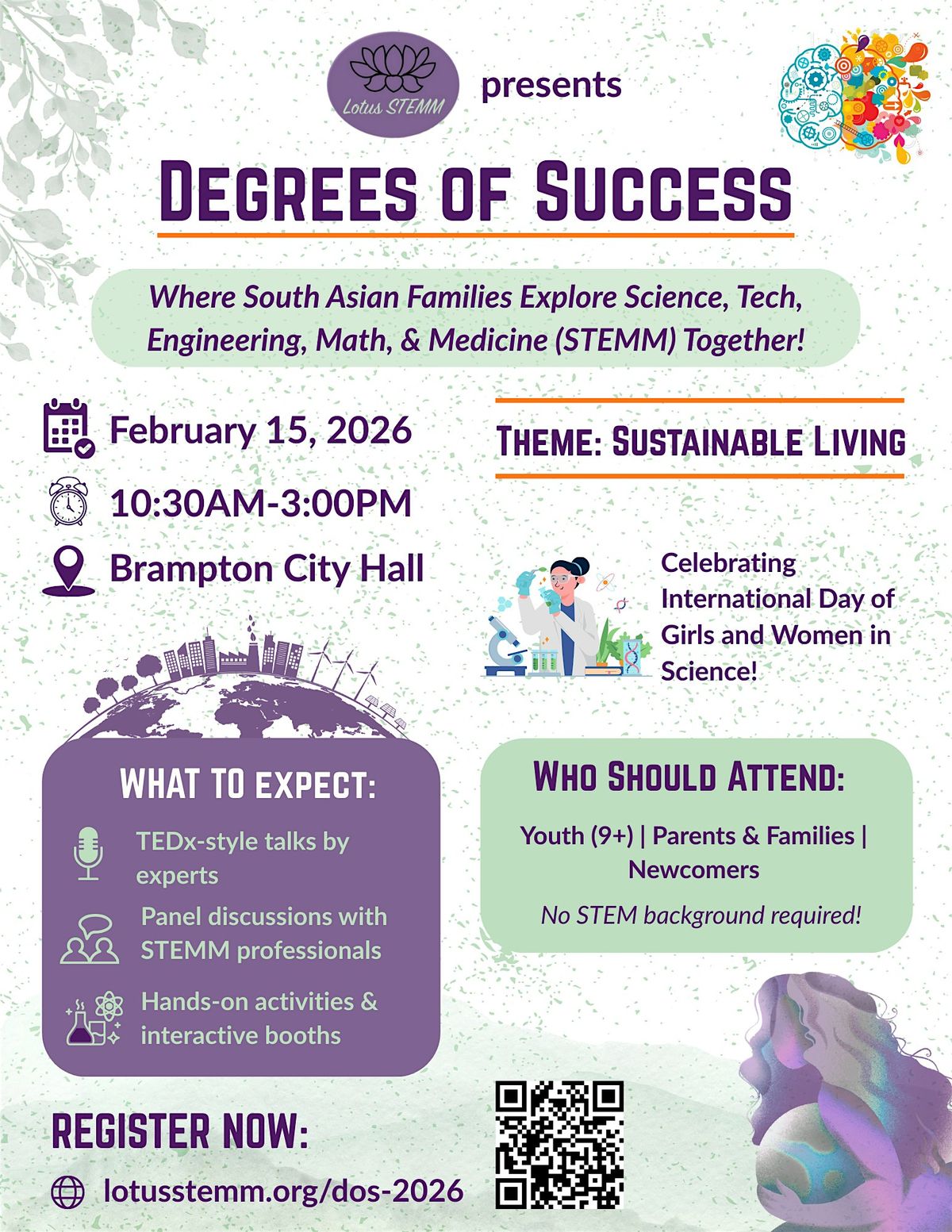 Our annual Degrees of Success Conference will be held on February 15th, 2026 hosted at the Brampton City Hall in the Peel Region. This free event is open to youth (aged 9+) and families, with special focus on newcomers. The 2026 theme is Sustainable Living, highlighting climate action and innovative solutions for a greener future. Designed to be interactive and inspiring, the conference will feature hands-on activities, engaging presentations, TEDx-style talks and a panel from distinguished South Asian speakers in STEMM. Speakers will share personal journeys and professional insights shaped by their South Asian heritage, highlighting the intersection between culture, sustainability, and STEMM careers. Past speakers have included youth featured by science organizations like NASA, student innovators who launched STEMM initiatives during COVID-19, as well as professors and educators.