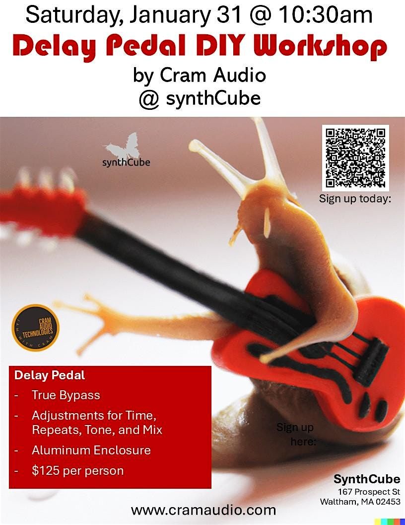 This is a medium part count project – but with guidance from the Cram team, it’s easy build for beginners! If you need help with your circuit, your instructors have 20+ years’ experience building, designing, and troubleshooting electronic circuitry. So rest assured that we will get your effect working and get you ready to explore the worlds of sound synthesis and electronics. Expect this workshop to last 2 – 3 hours.