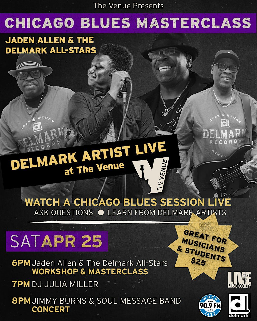 The evening begins with a one hour Masterclass will be led by blues legends The Delmark All-Stars (Mike Wheeler, Big Ray, Larry Williams, Roosevelt Purifoy) as they mentor up and coming vocalist, Jaden Allen. The event will be a "window in" to the rehearsal process complete real time mentorship, live "q and a" and steeped in Chicago Blues. DJ Julia Miller will spinning rare and classic Delmark Records vinyl immediately after class. The evening concert will feature a performance from the legendary Jimmy Burns & Soul Message Band.