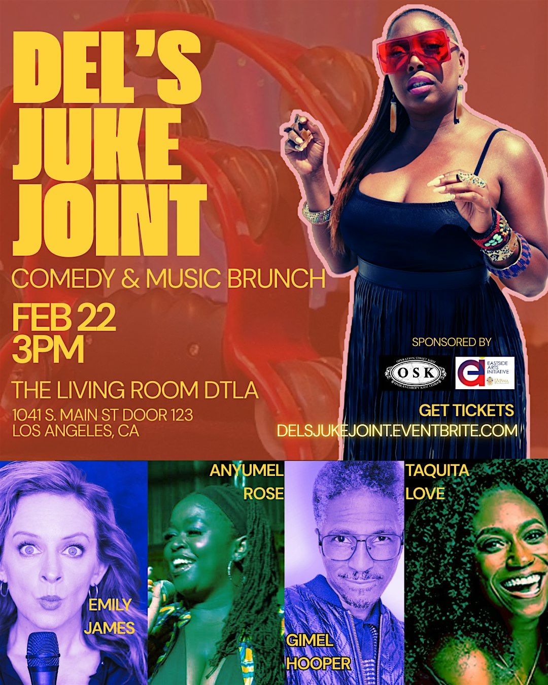 Get ready for a laid-back in-person experience at Del's Juke Joint! Hosted by Comedian and Singer Del Harrison, Del's Juke Joint is mixing up your Sunday with some hilarious comedy and feel-good comedy vibes from the hilarious Emily James, Anyumel Rose, Taquita Love and the poetry, rap, comedy styles of Gimel Hooper -- all with a live band in between while you brunch THE MOST DELICIOUS FOOD. Bring your friends, grab a plate, and settle in for nonstop laughs and finger-plucking, head-bobbing tunes. It's the perfect way to chill out and kick back --even YOU might even get on the mic. See you there! Sponsored by and our gratitude to: Eastside Arts Initiative and Operation Street Kidz.