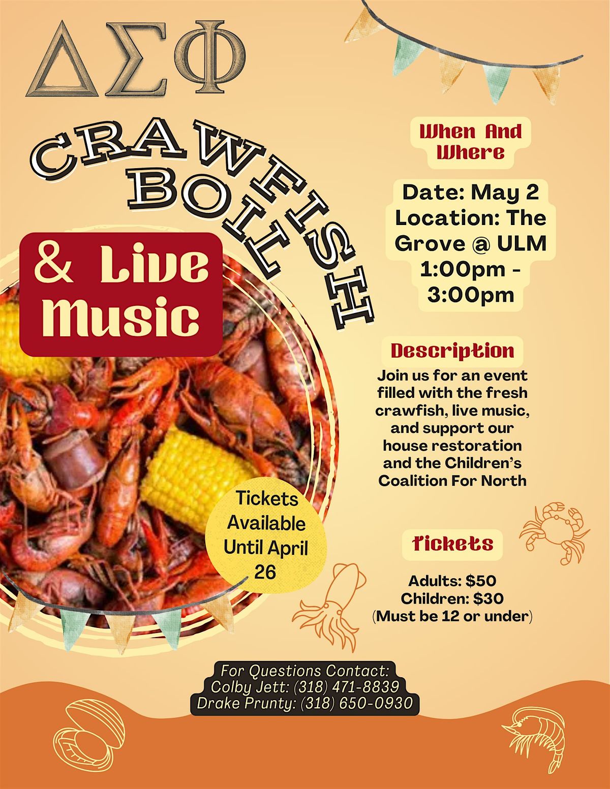 A Family Focused Crawfish boil featuring live music put on by the Zeta Pi chapter of Delta Sigma Phi.