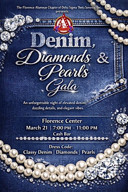 Join the Florence Alumnae Chapter of Delta Sigma Theta Sorority, Incorporated for Denim, Diamonds, and Pearls, an unforgettable evening filled with fashion, fellowship, and flair.