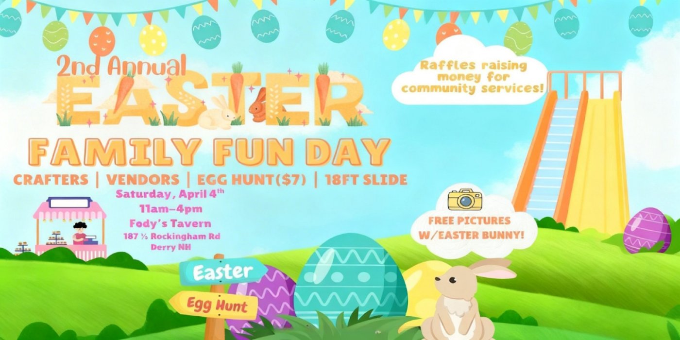 Join us for a fantastic in-person celebration at the Derry 2nd Annual Easter Family Fun Day! Bring your family and friends to enjoy a day packed with exciting activities, an egg hunt, and lots of laughs. It's the perfect way to welcome spring and create unforgettable memories together. Don't miss out on all the fun!