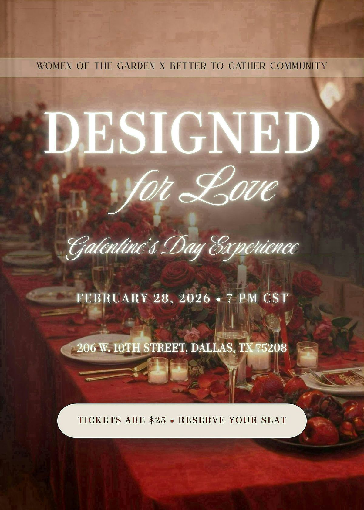 The Garden and Better to Gather Community are partnering together to welcome you to an intimate experience filled with women who are ready to show up fully—beautifully, honestly, and unapologetically. Designed for Love is an intimate Christian Galentine’s gathering.