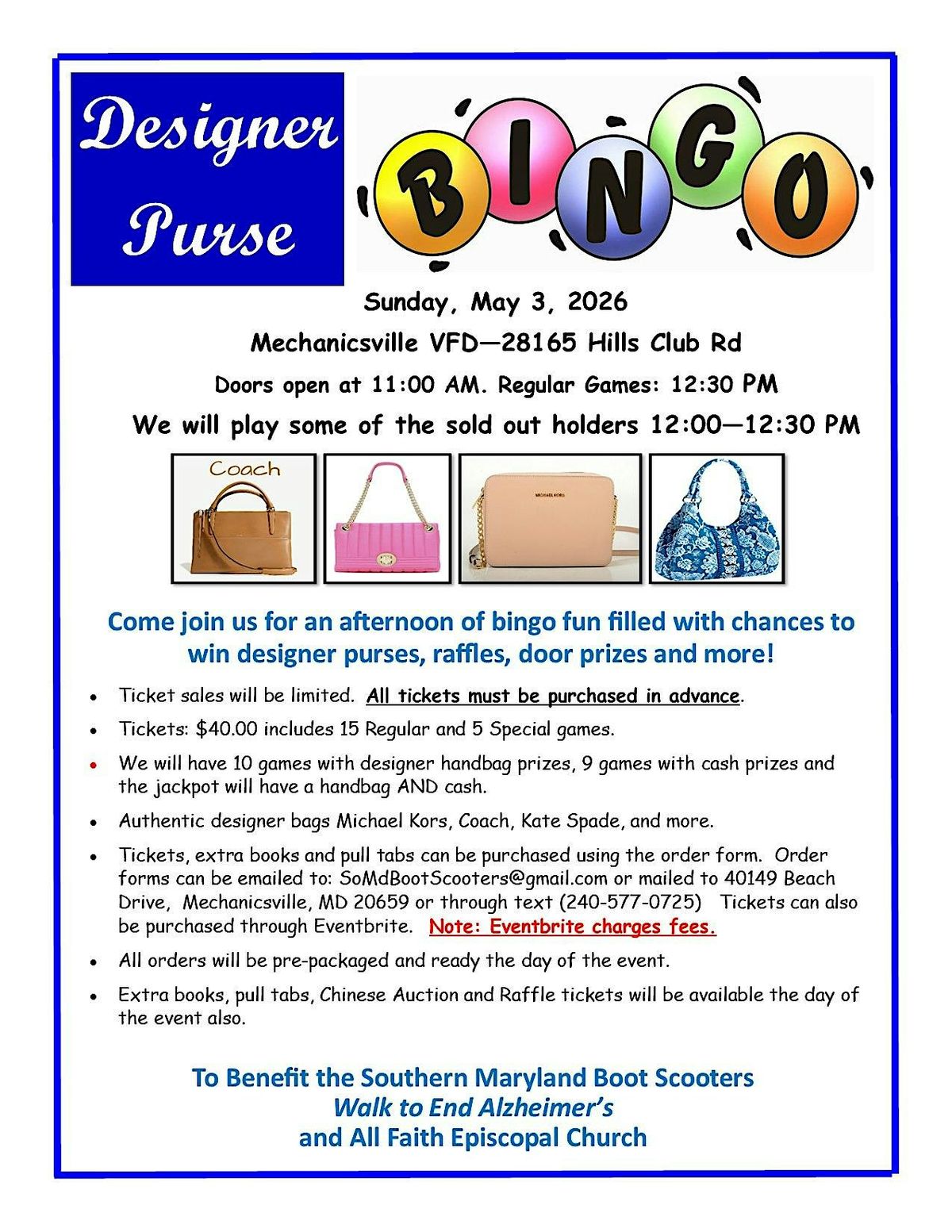 Come have some fun with your friends and play bingo. Half of the games will be for cash prizes and the other half for a designer handbag.