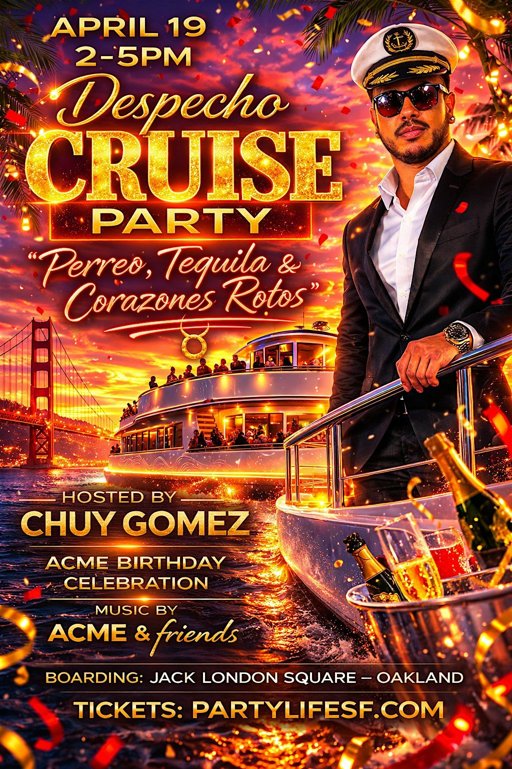Join us Sunday, April 19th from 2PMâ5PM for the Despecho Cruise Party, a Latin day party on the water celebrating Aries season with pure energĂa. Expect perreo, reggaeton, Latin hits, tequila shots, and unforgettable Bay views as we dance across the San Francisco Bay.
