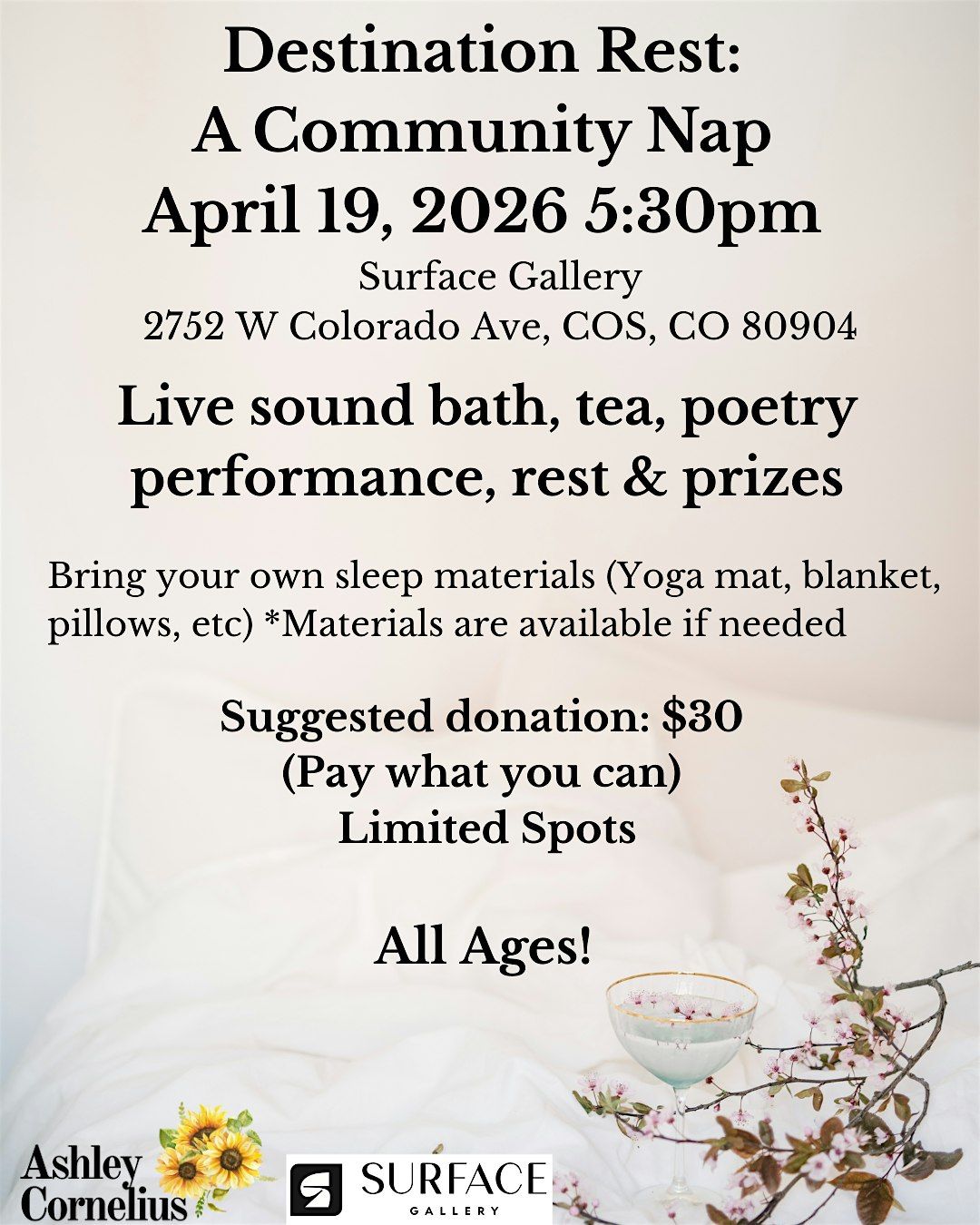 Bring your own sleep materials and anything that helps you rest. If you need materials (yoga mat, blanket ), we will have them available. Attendees will be invited to grab a cup of tea, d relax to the sounds of original affirmation poetry from the Poet Laureate of the Pikes Peak Region Ashley Cornelius, and a healing sound bath. Participants will be invited to rest/sleep. At the close of the event, attendees will be led through a creative art exercise in Surface Gallery exhibit to promote artistic expression and share in a community discussion about rest.