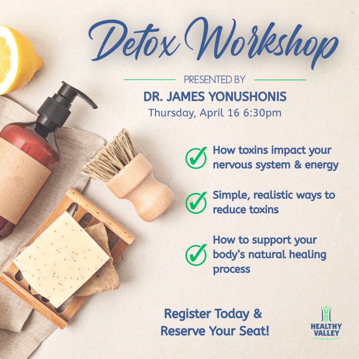 Join us for an eye-opening Detox Workshop where Dr. James Yonushonis will uncover the hidden toxins lurking in everyday items we use or consume — from household items to personal care and food sources.