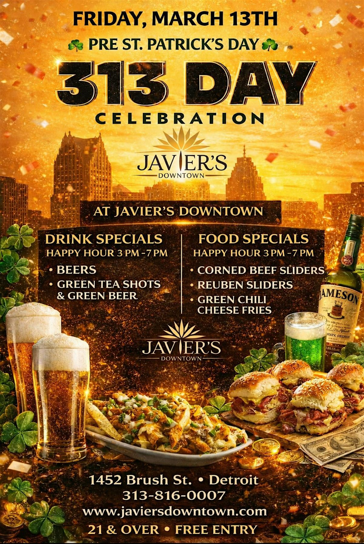 Welcome to Detroit 313 Day Friday - Pre St Patricks Special at Javier’s Downtown! Get ready to celebrate Detroit's iconic area code with a special event on March 13, 2026 at 3:00 PM (Eastern Time). Join us for a fun-filled evening with great music, delicious food, and amazing vibes. Don't miss out on this unique opportunity to experience the spirit of Detroit in style. See you there!