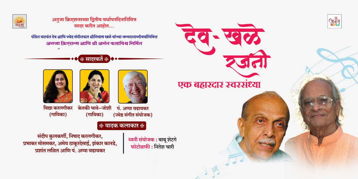 Celebrating the birth centenary of Pandit Yashwant Deo and veteran composer Shrinivas Khale, along with the 2nd anniversary of Anuja Creations, we present: "Dev-Khale Rajni... A Melodious Evening."