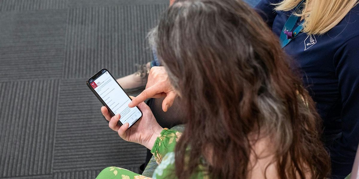 Image: Top-down view of a library staff member and customer seated together looking at a mobile phone.