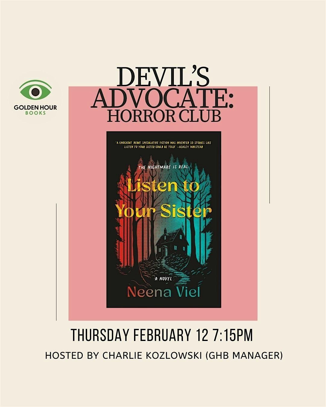 Join us for this month's meeting of the Devil's Advocate: Horror Book Club at Golden Hour Books.