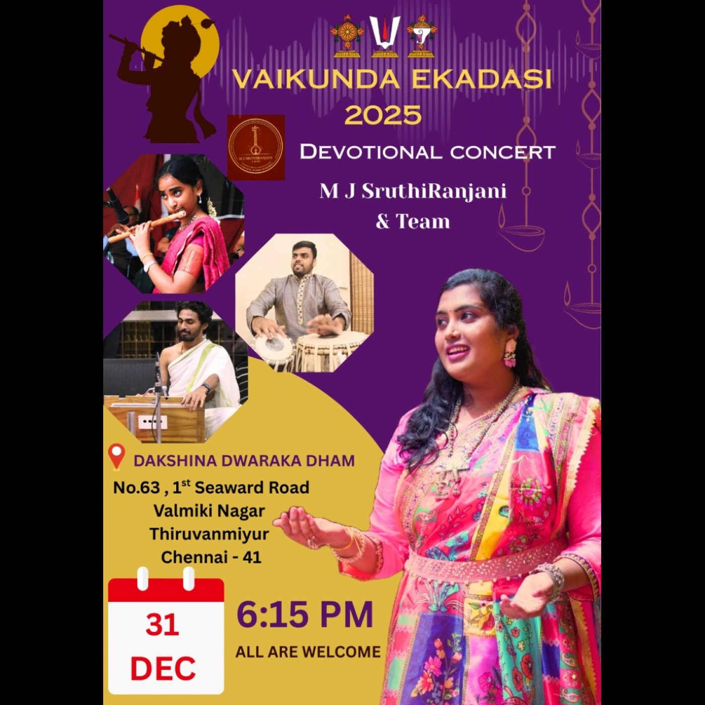 Join us for an exclusive devotional concert at Thiruvanmiyur Temple, as we celebrate Vaikuntha Ekadashi along with New Year’s Eve, Be part of it and immerse in divine music and bhakti. Let's welcome 2026 with the divine musical experience!