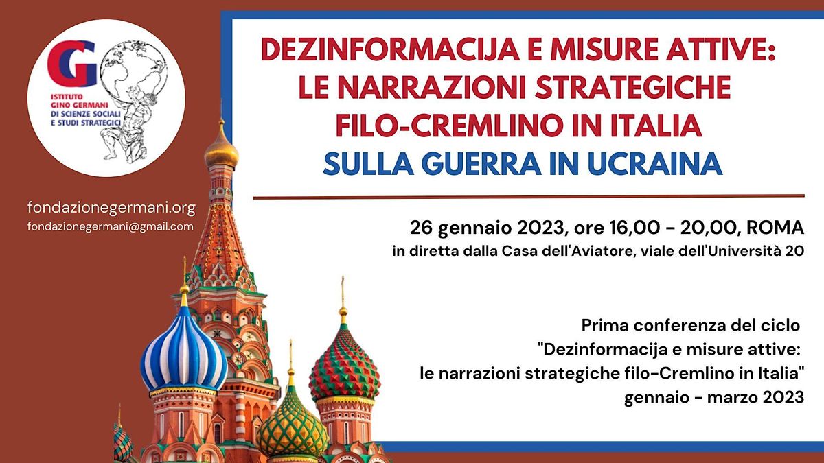 L'Istituto Gino Germani è lieto di annunciare un prossimo ciclo di tre conferenze sul tema “Dezinformacija e misure attive: le narrazioni strategiche filo-Cremlino in Italia”, che si svolgerà nel periodo gennaio-marzo 2023 presso la Casa dell’Aviatore, viale dell’Università 20 – Roma.