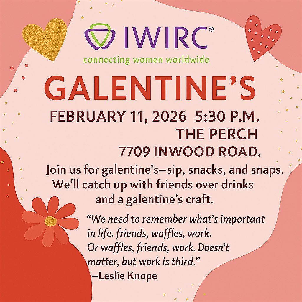 We’re thrilled to invite you to the DFW IWIRC Galentines — an evening of connection, celebration, and laughter with phenomenal women professionals! The festivities will take place on February 11th, 2026 starting at 5:30 PM in the private upstairs room at Perch Bistro & Bar, located at 7709 Inwood Rd, Dallas, TX 75209.