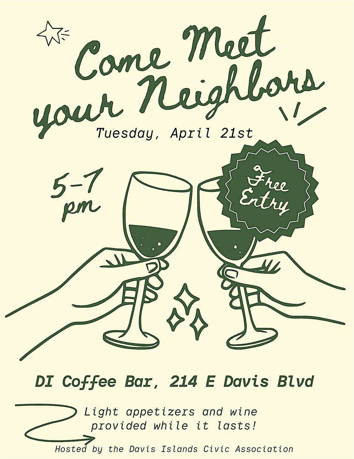 Come join us in person for a fun and casual gathering! It's a great chance to meet new people, catch up with neighbors, and enjoy some good vibes. Whether you're new to the area or a longtime local, this is the perfect hangout to connect and make friends. Don’t miss out on a chill evening full of laughs and friendly faces!