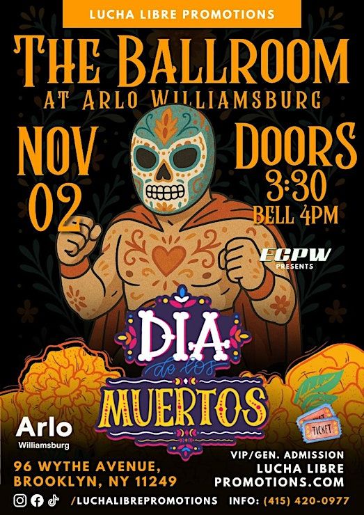 Come join us for an epic night of Lucha Libre action and celebration of Dia de Muertos at The Ballroom Arlo Williamsburg! Get ready for high-flying moves, colorful masks, and a lively atmosphere. This in-person event will showcase the best of Lucha Libre in the heart of Brooklyn. Don't miss out on this unique experience that combines athleticism with tradition. Grab your friends and immerse yourself in the excitement of Dia de Muertos Lucha Libre!