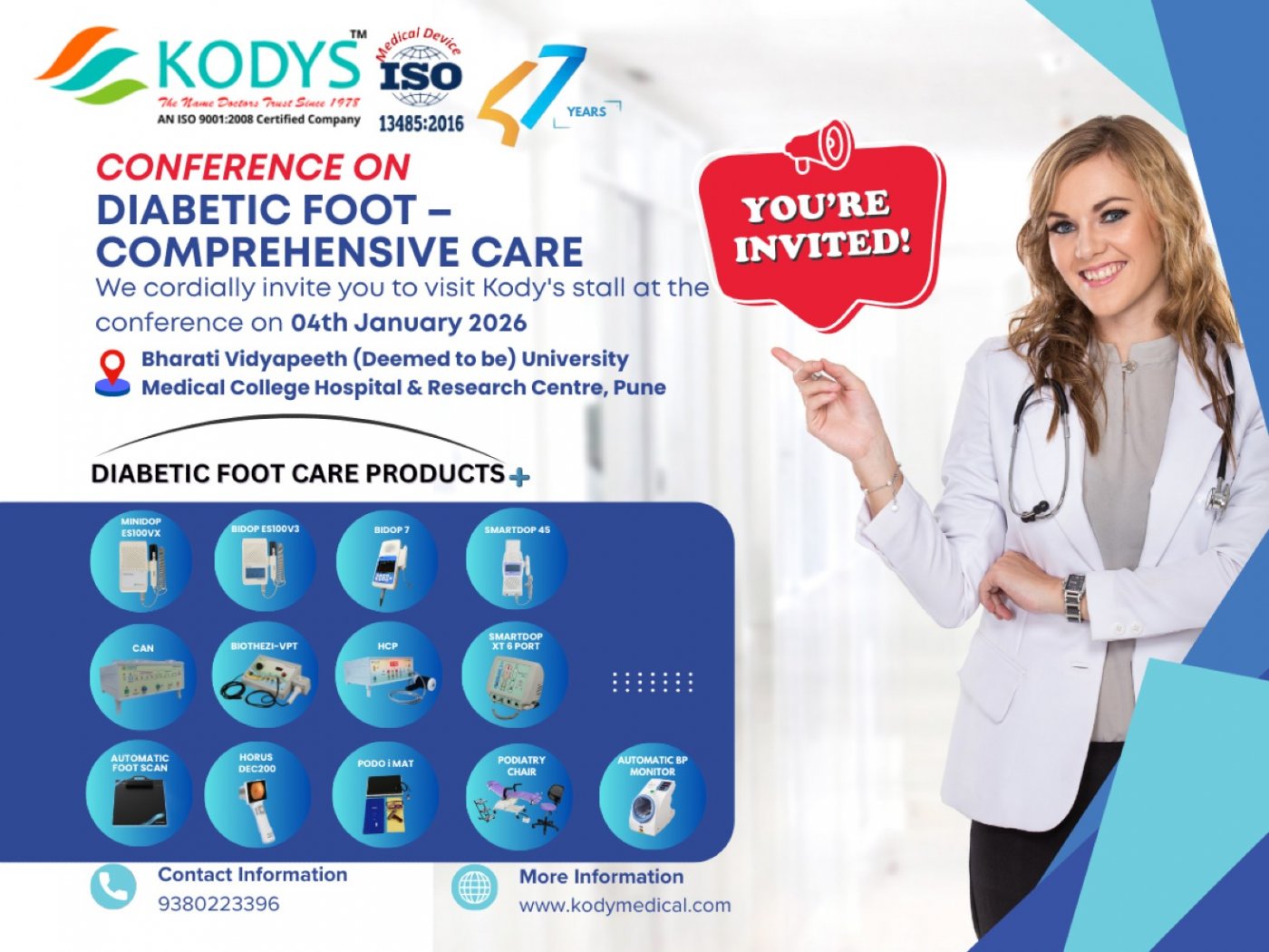 With 47 years of expertise in medical device innovation, Kody Medical has been dedicated to supporting accurate diagnosis, improving patient outcomes, and advancing healthcare technology. We invite healthcare practitioners, surgeons, diabetologists, and specialists to visit our stall and explore our ISO-certified range of diabetic foot diagnostic solutions designed for early detection, precise assessment, and effective management.