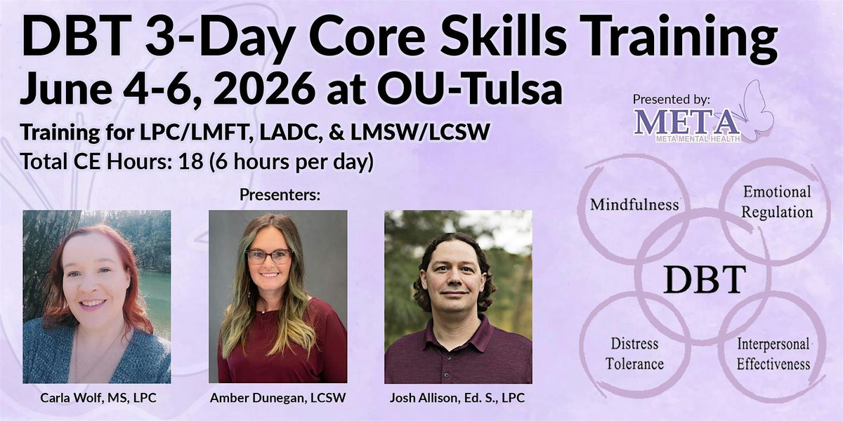 Hosted by Meta Mental Health, LLC, this training provides 18 CEUs (6 hours per day) and is approved by the following Oklahoma licensing boards: