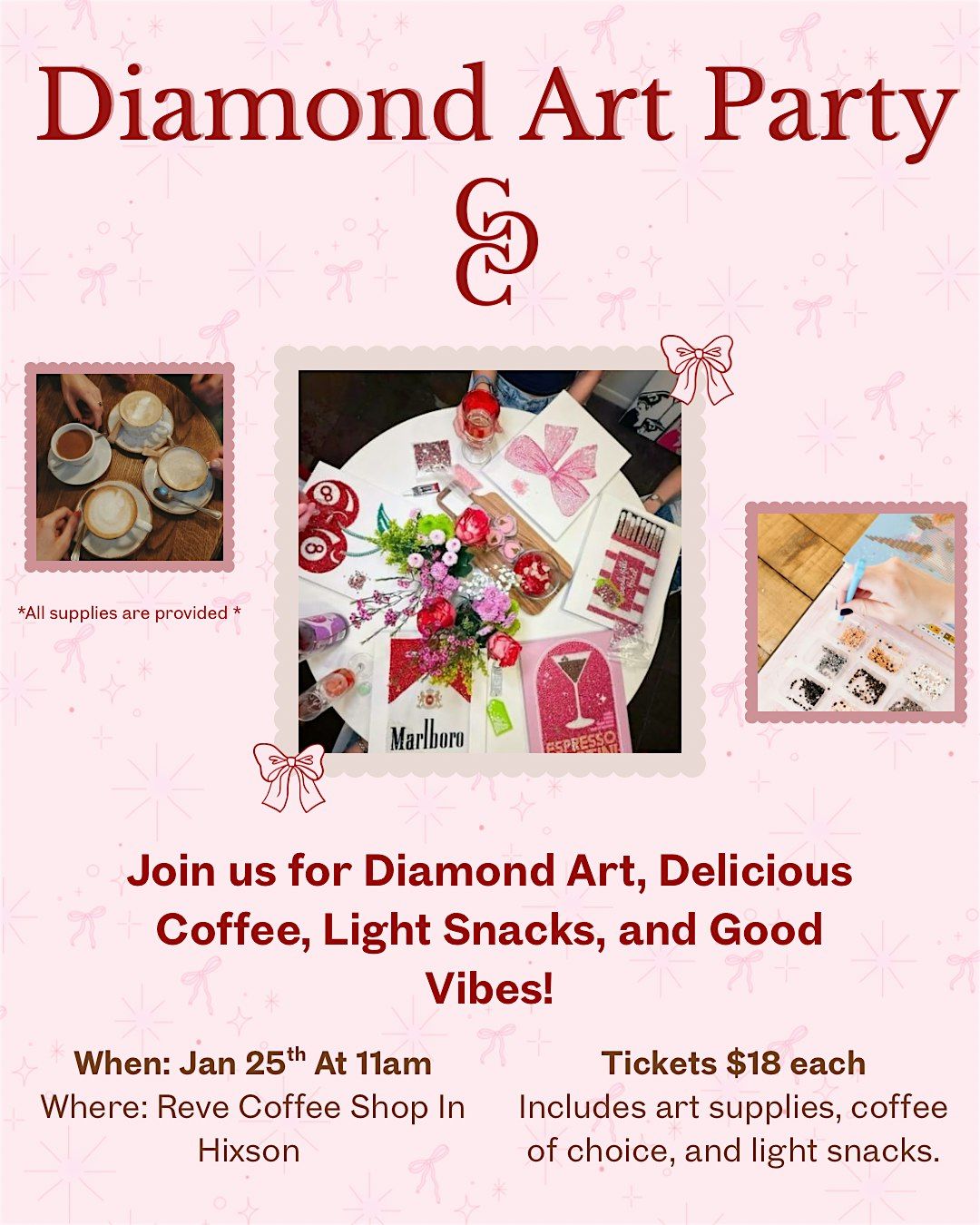 Welcome to the Diamond Art Party! Join us at Reve Coffee and Books on January 25, 2026 at 11:00 AM for a sparkling good time. Get ready to unleash your creativity and make some dazzling art pieces with fellow art enthusiasts. No experience needed, just bring your enthusiasm and we'll provide all the materials. Let's have a fun and relaxing day creating beautiful diamond art together! See you there!