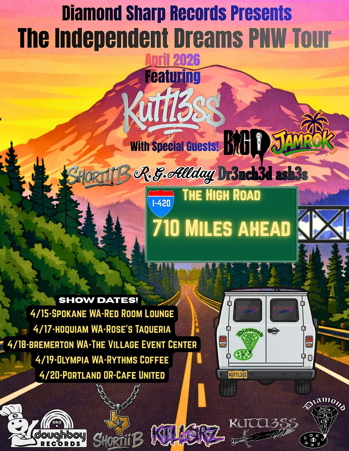 This Spring Diamond Sharp Records Recording Artists Kuttl3ss(Spokane WA) & Jamrok(Helena MT)Will be hitting the road with 4 Other Top Tier Recording Artists From the Northwest On The Independent Dreams Tour! Featuring Special Guests: BIG D(Portland OR) Shortii B(Missoula MT)RG All Day(Spokane WA) Dr3nch3d Ash3s(Spokane WA) This Is a Regional Lineup I promise you don’t want to miss And On Wednesday April 15th This Loaded Tour lineup will be live at the Red Room Lounge In Spokane WA! From Tons of bass Lights visuals & More! Get ready for an unforgettable night of Good times, music Entertainment, High energy & great Memories!
