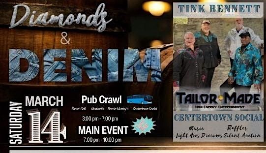Welcome to Diamonds & Denim with Tink Bennett and Tailor Made at Centertown Social! Get ready for a night of great music and fun vibes on March 14, 2026. Have fun at the pre-event pub crawl and join us for an unforgettable experience with an amazing performance in a lively atmosphere. Don't miss out on this opportunity to create lasting memories with friends and loved ones. Mark your calendars and we'll see you there!