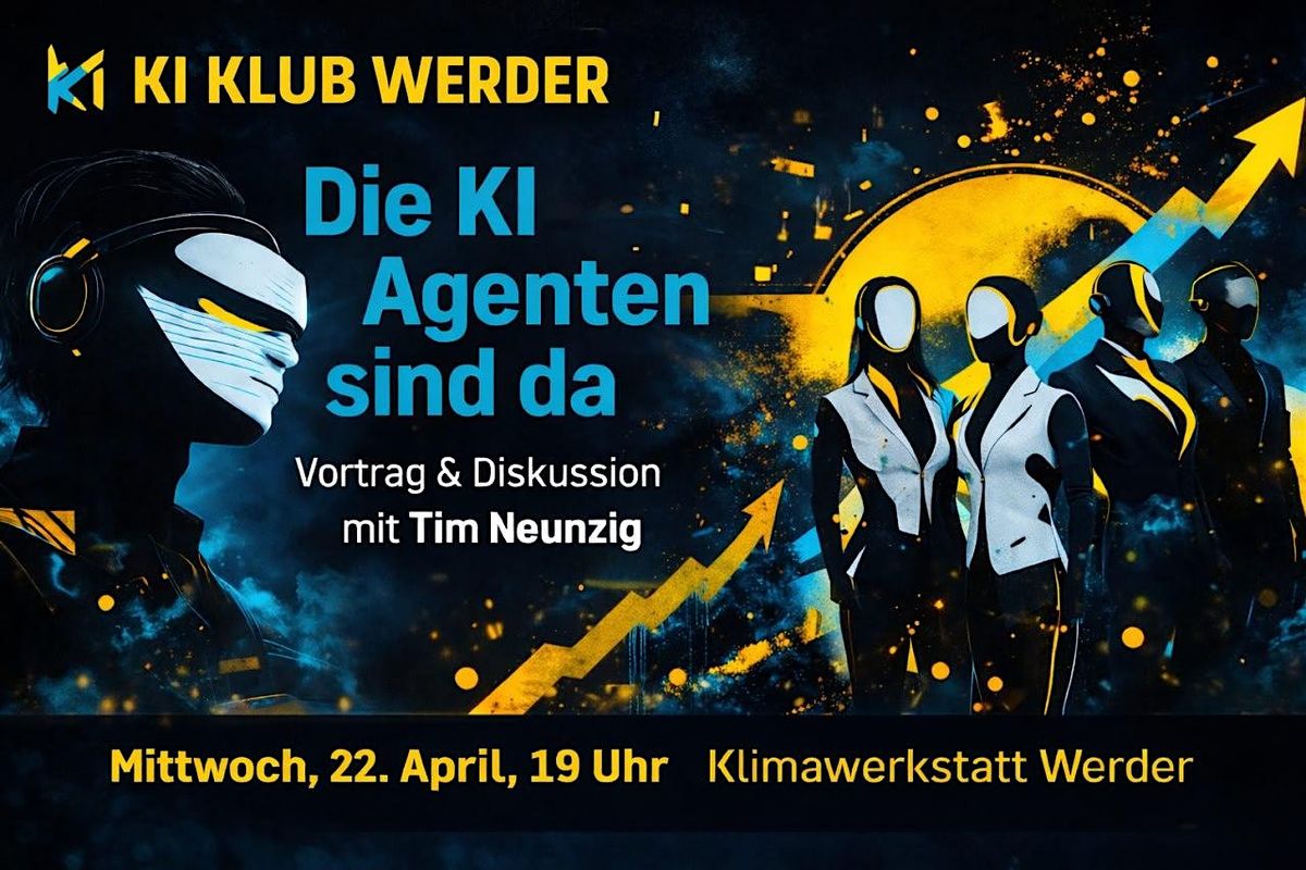 Vor einem Jahr hieß ein Vortrag im KI Klub Werder noch: Die KI-Agenten kommen. Heute lässt sich sagen: Sie sind längst da.Seitdem hat sich im Bereich der KI-Agenten enorm viel verändert. Die Entwicklung hat sich rasant beschleunigt, neue Tools und Plattformen entstehen laufend, und Systeme wie OpenClaw zeigen, wie stark KI bereits heute Arbeitsprozesse, Geschäftsmodelle und den Alltag verändern können. Rund um den Globus werden neue Unternehmen auf dieser Grundlage gegründet, während sich die Dynamik der KI-Welt gefühlt stündlich weiterdreht.Dieser Abend bietet einen verständlichen Einstieg für Neueinsteigerinnen und Neueinsteiger, ordnet die aktuelle Lage ein und lädt zur gemeinsamen Diskussion ein. Es geht um die Frage, wo wir gerade stehen, was KI-Agenten heute schon können und was diese Entwicklung für Wirtschaft, Gesellschaft und den Alltag bedeutet.Vortrag & Diskussion mit Tim Neunzig.Wie immer ist die Veranstaltung kostenlos und offen für alle.