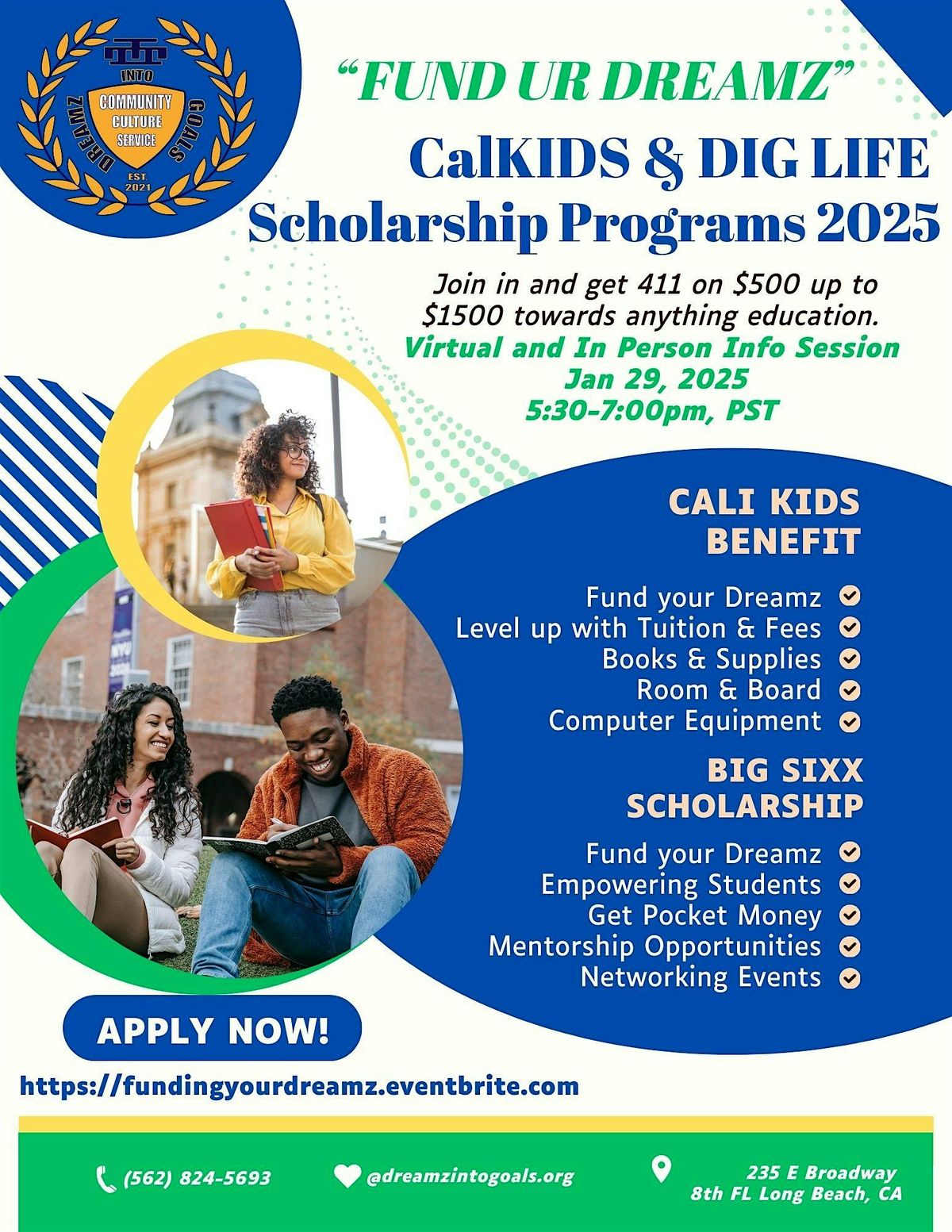 Join us on January 29, 2025, from 5:30 PM to 6:00 PM for an enlightening Scholarship Information Session hosted by CalKIDS and Dreamz Into Goals (DIG LIFE).This hybrid event—offered both virtually and in-person at 235 E Broadway, 8th Floor, Long Beach, CA—aims to empower students by providing essential information on various scholarship opportunities.