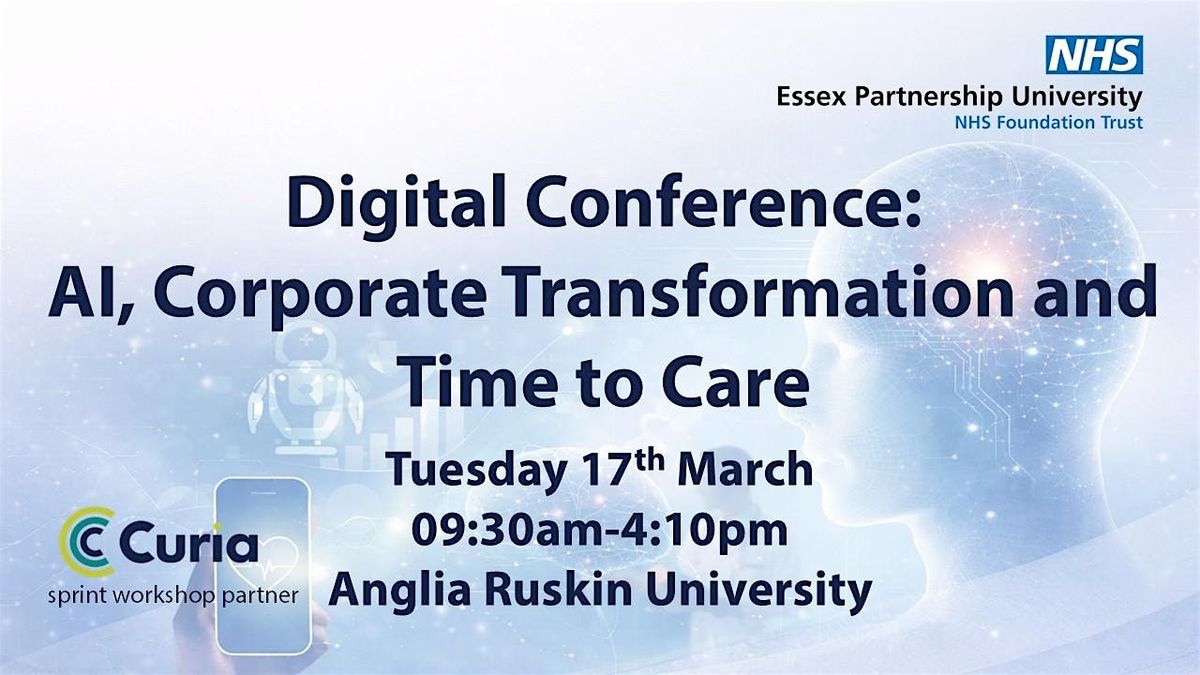 Hosted by Essex Partnership University NHS Foundation Trust (EPUT), in partnership with Anglia Ruskin University (ARU), with sprint sessions delivered by policy institute Curia, this East Anglia Digital Conference brings together NHS leaders, innovators and academics to explore how artificial intelligence (AI) can be deployed at scale to transform corporate services and strengthen frontline care.