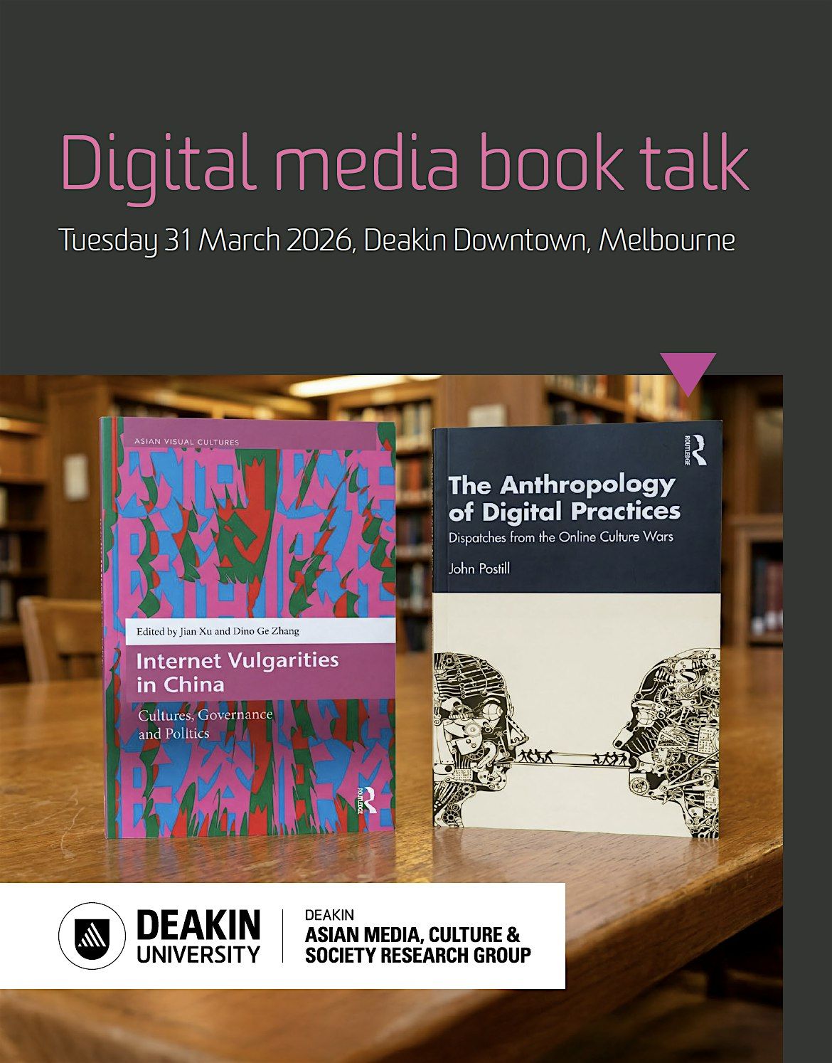 The book talk features two new books: The Anthropology of Digital Practices (authored by John Postill, Routledge, 2024) and Internet Vulgarities in China (co-edited by Jian Xu and Dino Ge Zhang, Routledge, 2026). Following brief introductions to their books, the authors will engage in a dialogue on shared themes across the two works and respond to questions from the audience.